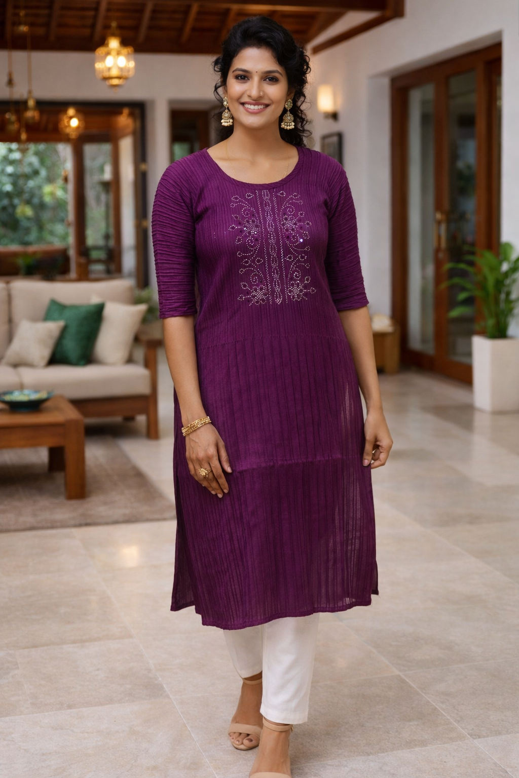 Style with high-waisted palazzo pants for a sophisticated fusion look, or pair with churidar for a modern ethnic ensemble. The textured fabric catches light beautifully, making it perfect for festive occasions and evening gatherings.
